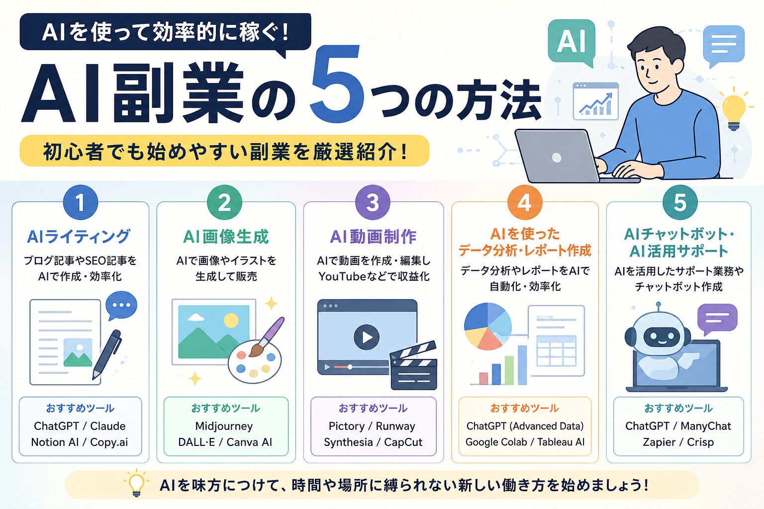 近年、生成AIの進化により、誰でも気軽に副業を始められる時代になりました。専門スキルがなくても、AIを活用すれば短時間で収益化できる可能性があります。本記事では、AIで副業を始める具体的な5つの方法と、効率よく稼ぐためのコツを紹介します。